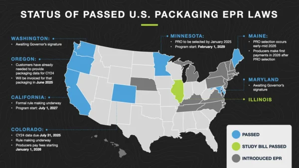 In theory, that’s a powerful shift. Instead of society dealing with the aftermath of waste, companies face financial incentives to reduce it. As of 2025, the following states have some type of EPR laws on their books: